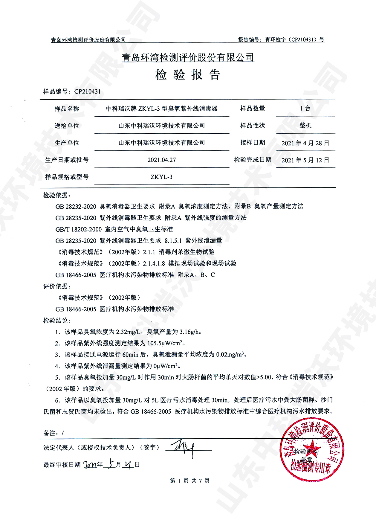 醫(yī)療污水處理設(shè)備檢測報告~臭氧消毒